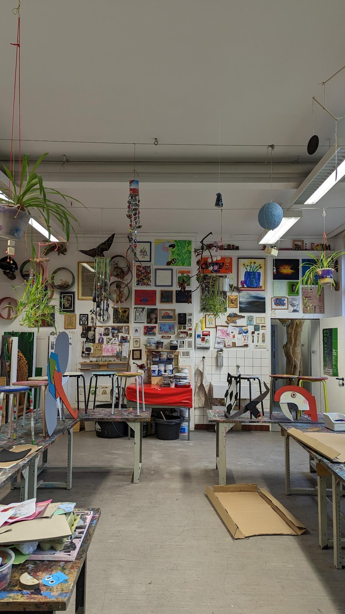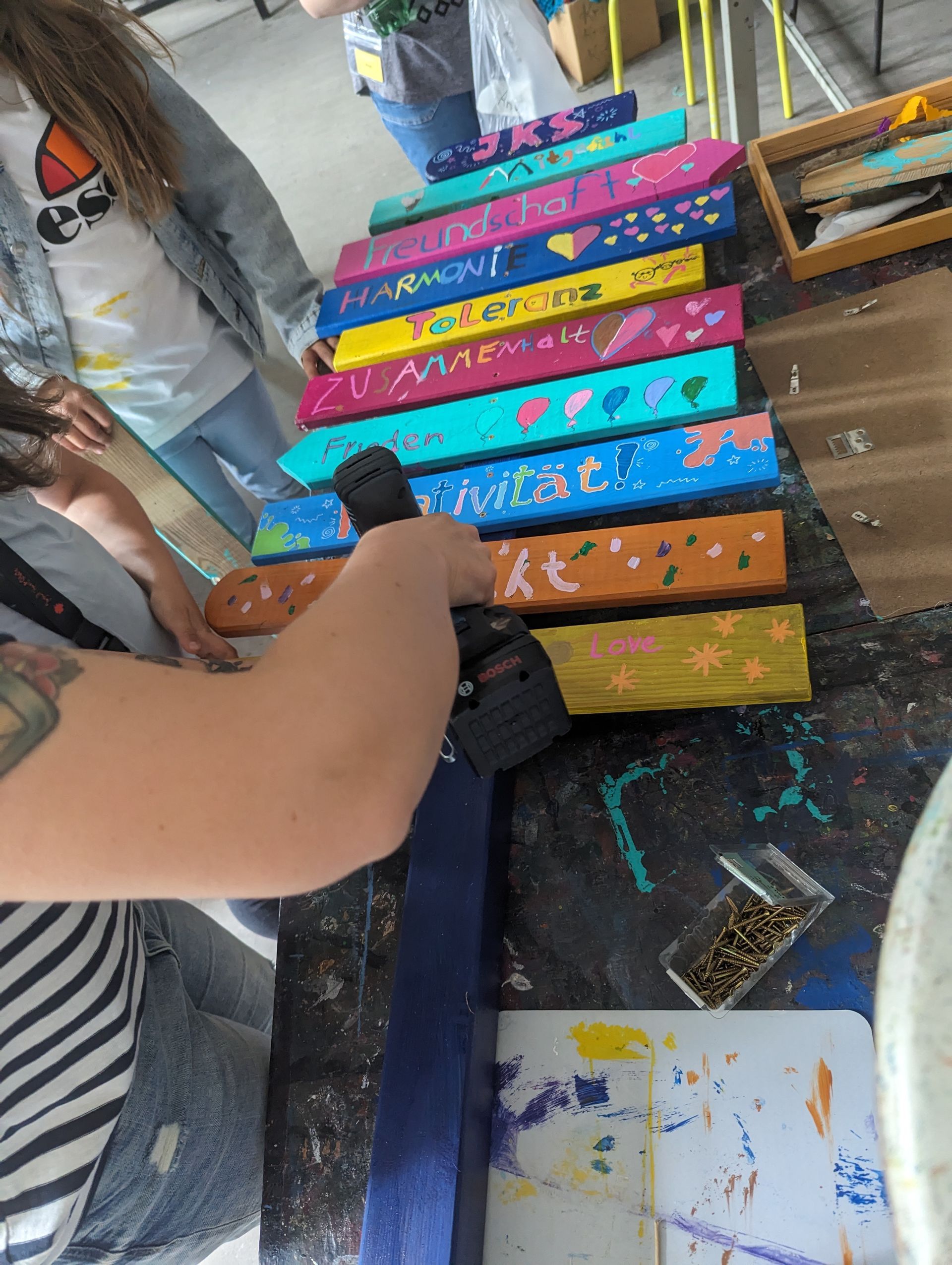 Upcyclingmaterialien, Farben, drinnen und draußen.