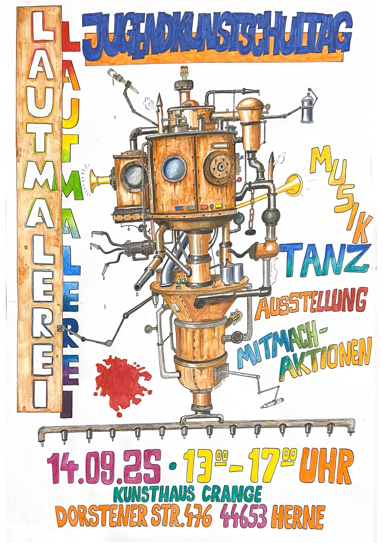 Du kannst uns auch in diesem Jahr wieder auf dem Herkules-Festival, beim Mitmachfest im Gysenbergpark oder auch beim Kanalfest Bickern mit lustigen und kreativen Workshopangeboten finden. Selbstverständlich wird es auch im Jahr 2024 wieder einen Jugendkunstschultag geben. Um nichts zu verpassen, folg’ uns auf Instagram und Facebook!